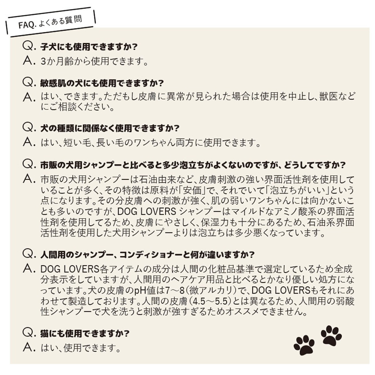シャンプーには、3ヶ月齢の子犬期から使用できるマイルドな界面活性剤(ココイルグルタミン酸TEA、コカミドプロピルベタイン)を使用しています。