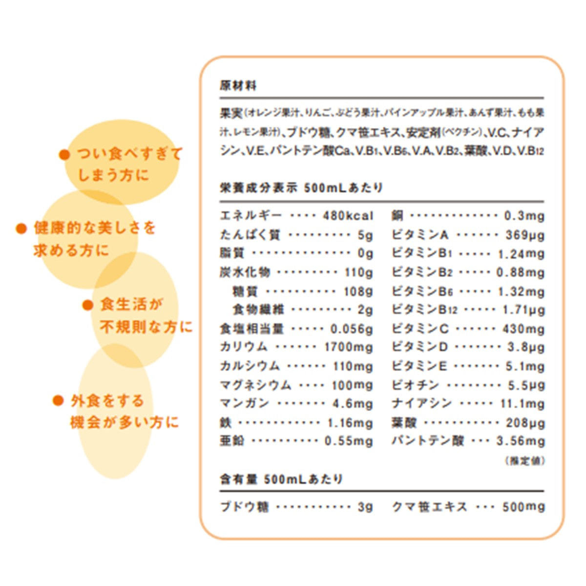 濃縮オレンジ果実(ブラジル製造)、りんご、ぶどう果汁、パインアップル果汁、あんず果汁、もも果汁、レモン濃縮果汁、ブドウ糖、クマ笹エキス/安定剤(ペクチン)、ビタミンC、ナイアシン、ビタミンE、パントテン酸カルシウム、ビタミンB1、ビタミンB6、ビタミンA、ビタミンB2、葉酸、ビタミンD、ビタミンB12