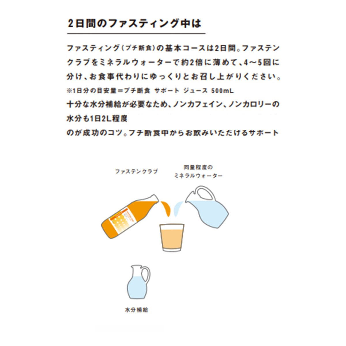 ファステン クラブⅡをミネラルウォーターで約2倍に薄めて、5回以上に分け、お食事代わりにゆっくりとお召し上がりください。