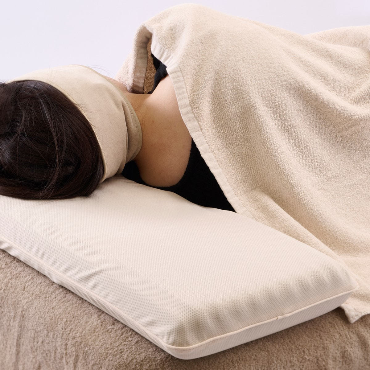 頭と頸椎部分にフィットしやすい「くぼみ」をつけた独自形状により、従来のまくらよりも、やさしく頭と首を包み込み、負担の少ない安定したリラックス姿勢をサポートします。