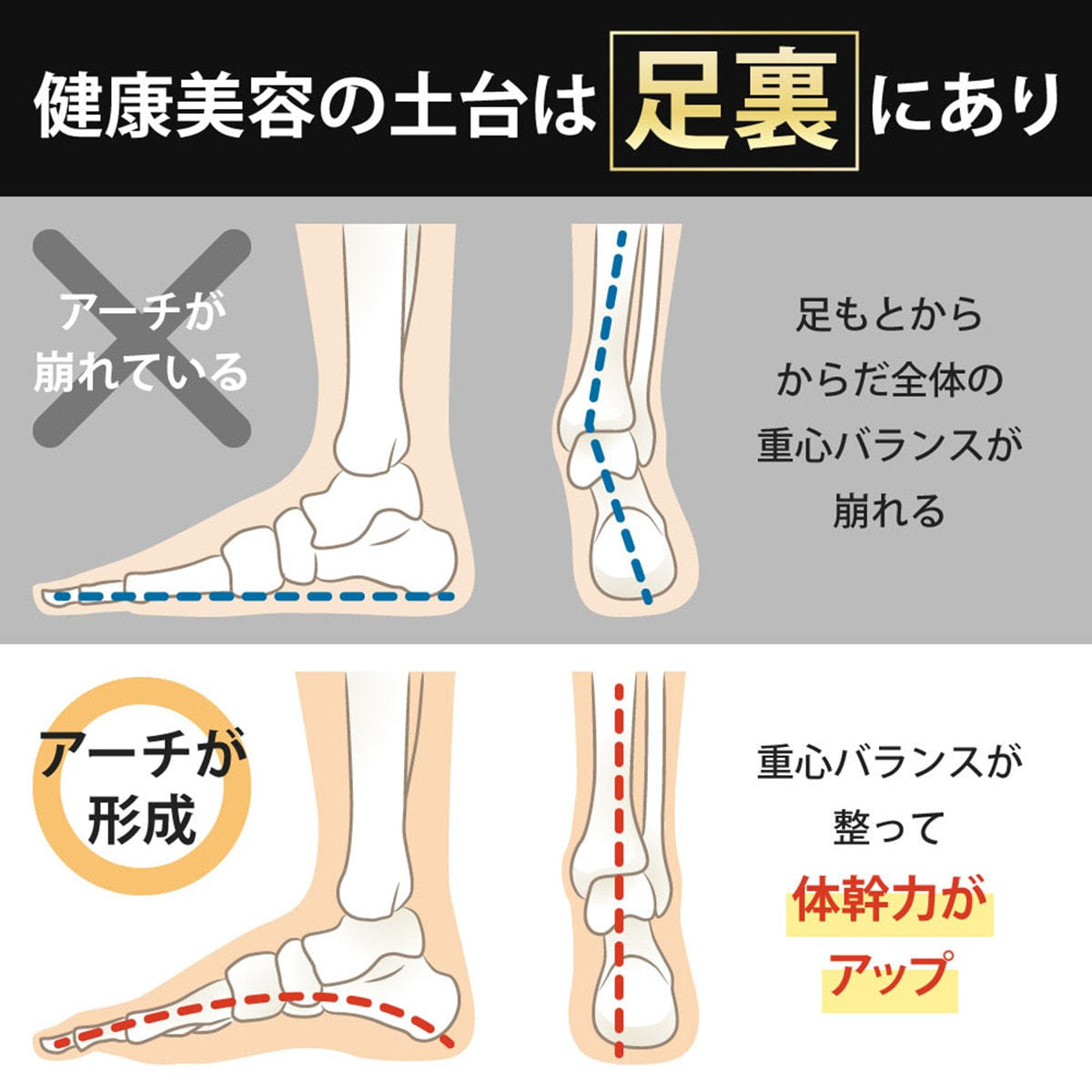 土踏まずのアーチが崩れていると、体全体のバランスが悪くなり、むくみやずん胴体型の原因にもなります。フットサポーターは、特許技術により土踏まずのアーチの形成をサポートします。