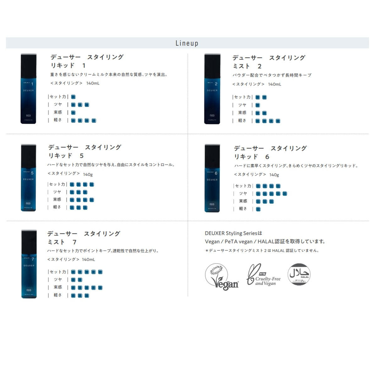 デューサースタイリングシリーズはVegan/PeTA vegan/HALAL認証を取得しています。