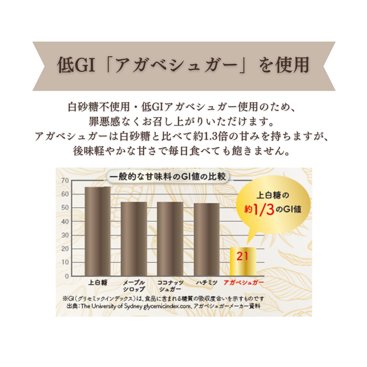 白砂糖不使用・低GIアガベシュガー使用のため、罪悪感なくお召し上がりいただけます。アガベシュガーは白砂糖と比べて約1.3倍の甘味を持ちますが、後味軽やかな甘さで毎日食べても飽きません。