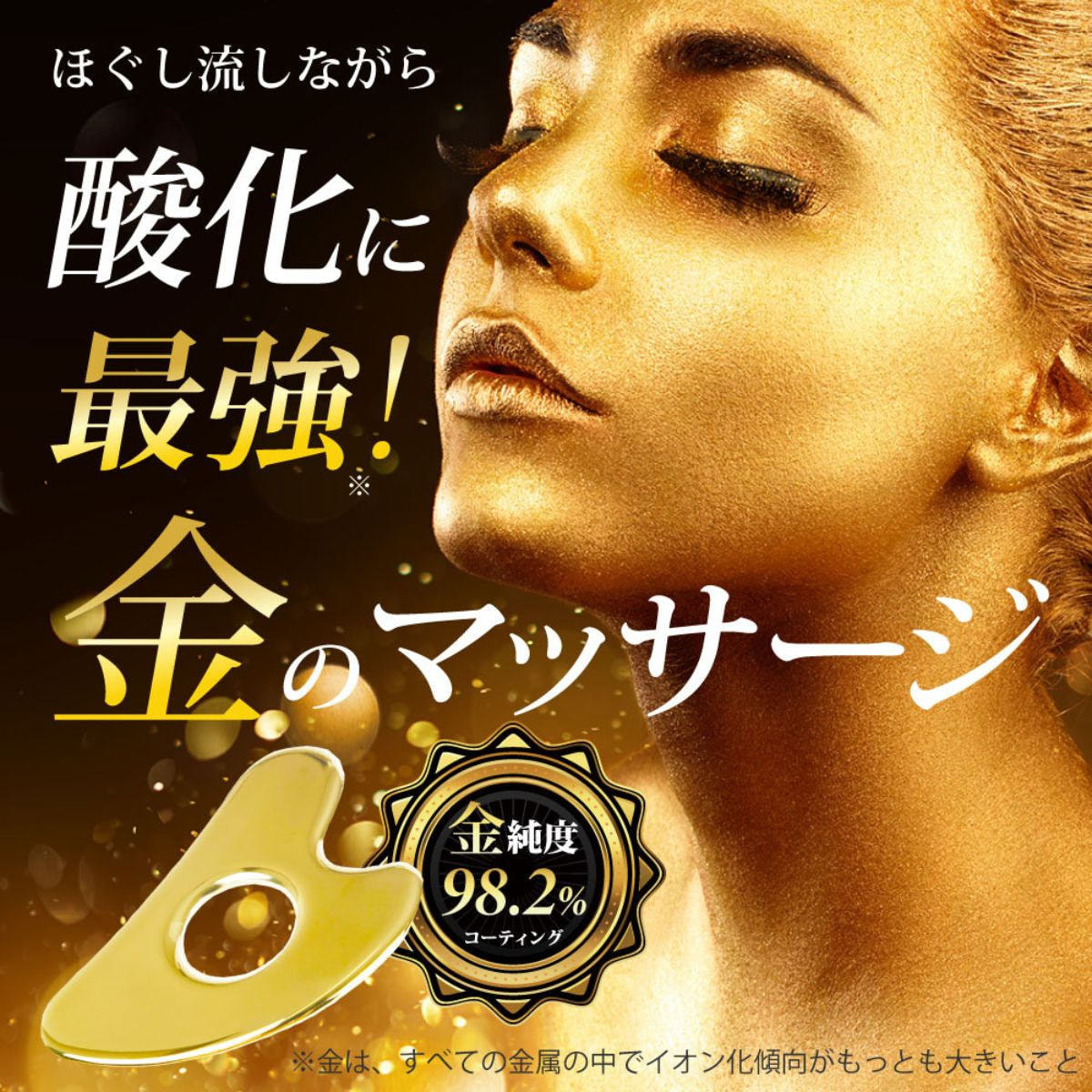 かっさプレートを、純度98.2%の金でコーティングしました。 マッサージでほぐし流しながら、耐酸化ケアを叶えます。