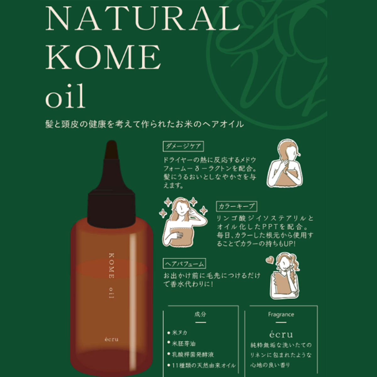米ヌカ、米胚芽油、乳酸桿菌発酵液、11種類の天然由来オイルを使用したナチュラルなオイルです。