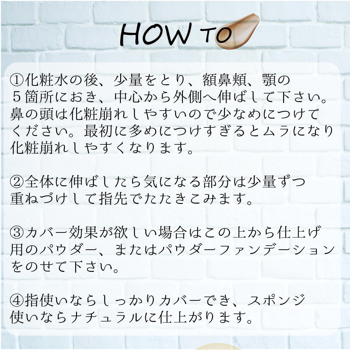 下地で肌を整えた後、パフまたは指に適量をとり、ムラなく肌にのばします。