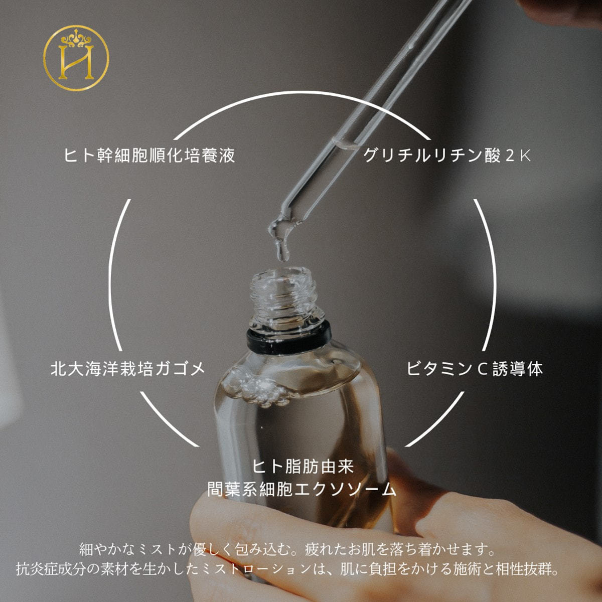 抗炎症成分の素材を活かしたミストローションは、攻めの施術との相性も抜群。