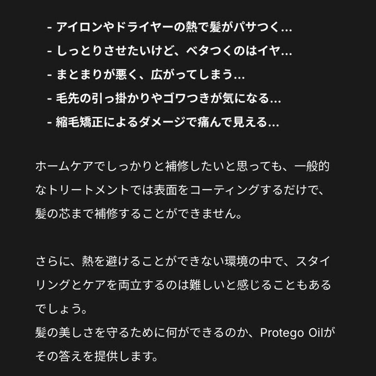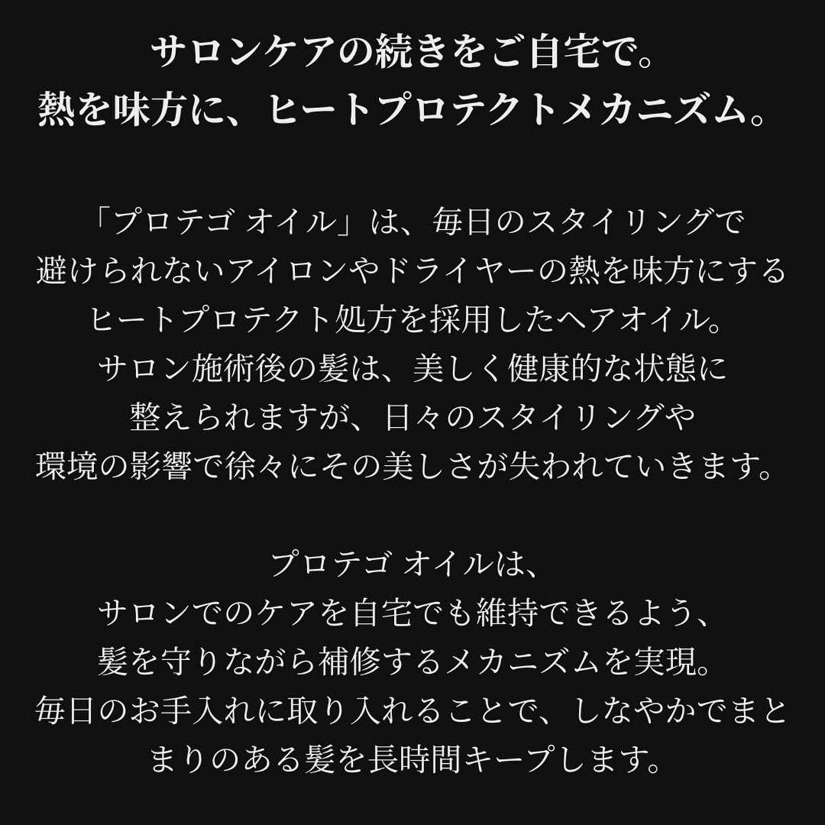 「プロテゴオイル」は、毎日のスタイリングで避けられないアイロンやドライヤーの熱を味方にするヒートプロテクト処方を採用したヘアオイル。