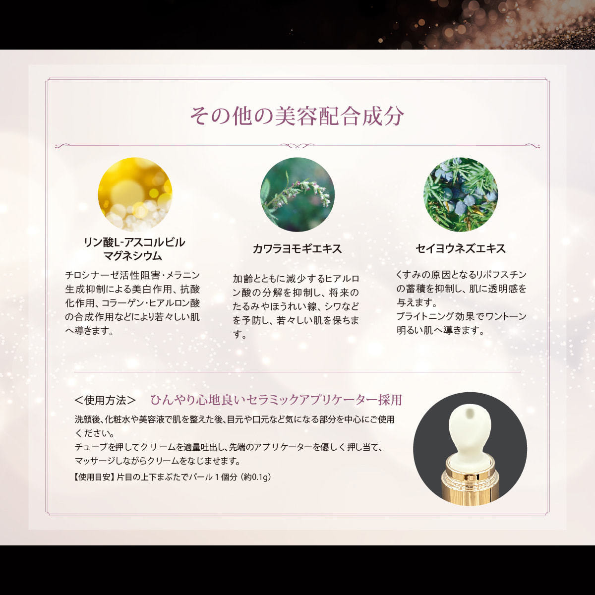 チロシナーゼ活性阻害・メラニン生成抑制による美白作用、抗酸化作用、コラーゲン・ヒアルロン酸の合成作用などにより若々しい肌へ導きます。