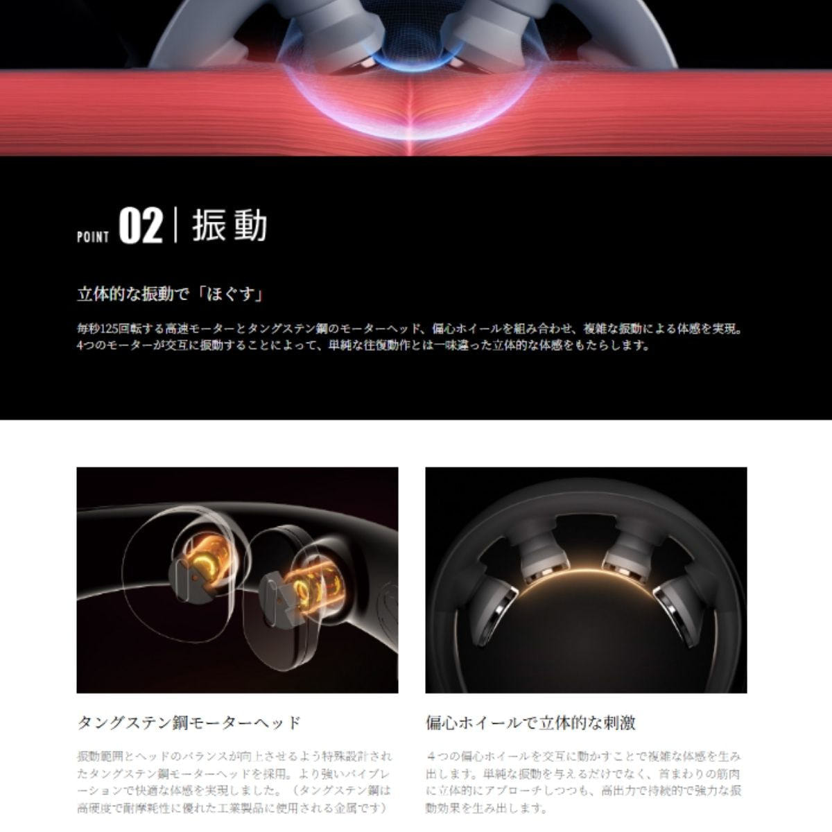 中周波EMSによる筋肉刺激と、モーターによる物理的な振動、赤色LED、ヒーターによる直感的な温かさ、異なる4つの機能が組み合わさる事で立体的で、やさしい使い心地を実現しています。