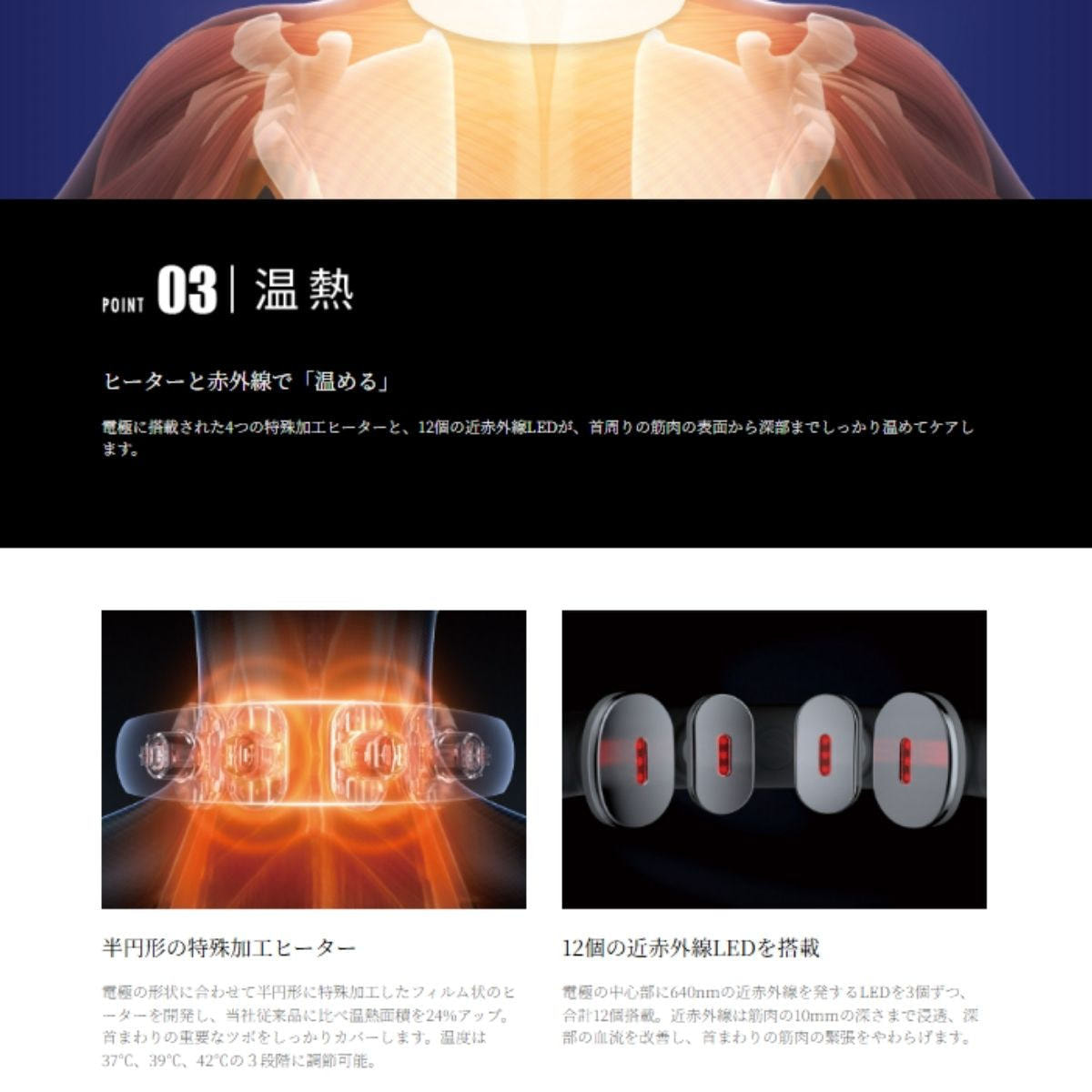 1回15分でお手軽にケアが可能で約126gと軽量ながら、充実した機能を搭載した首用EMS機器のハイエンドモデルです。