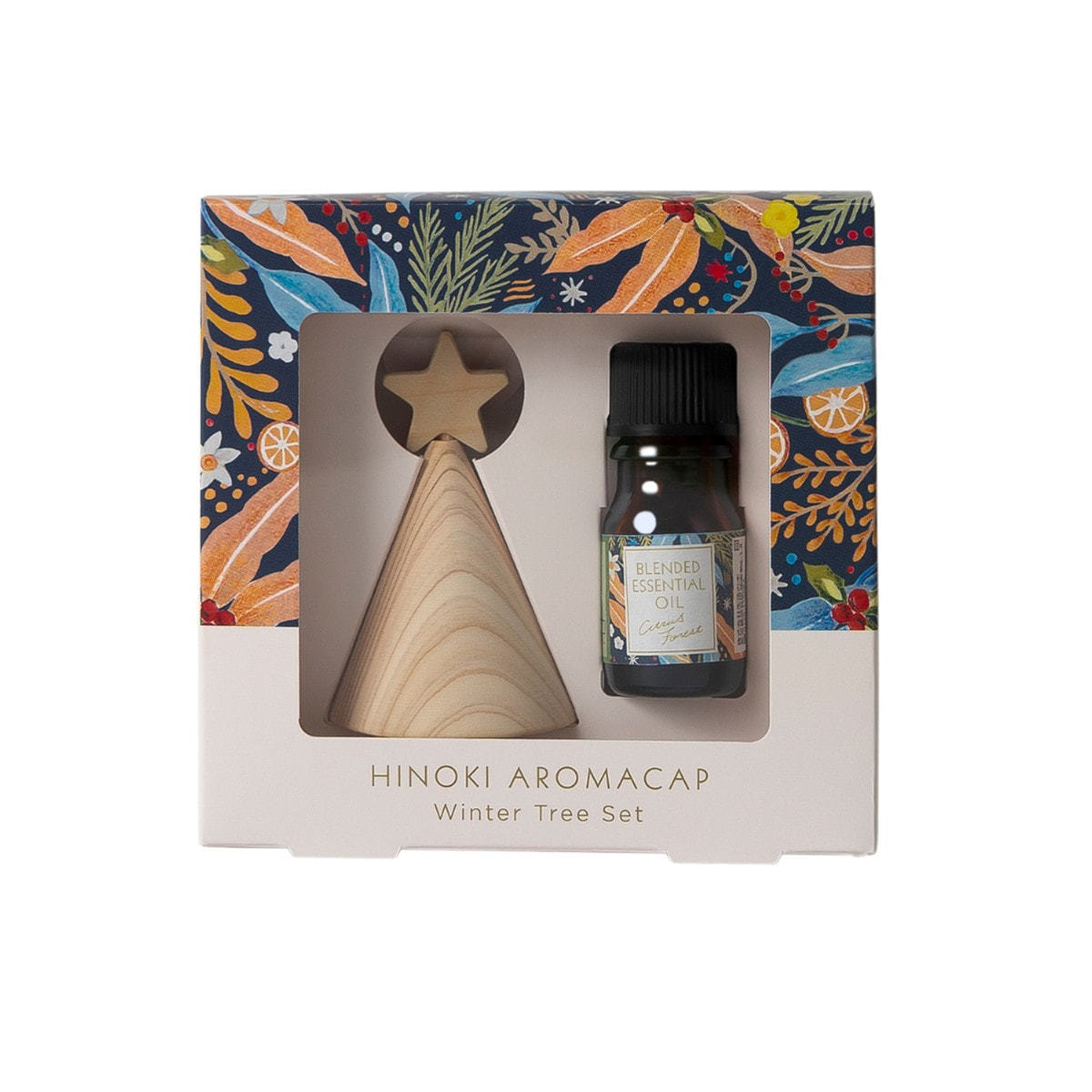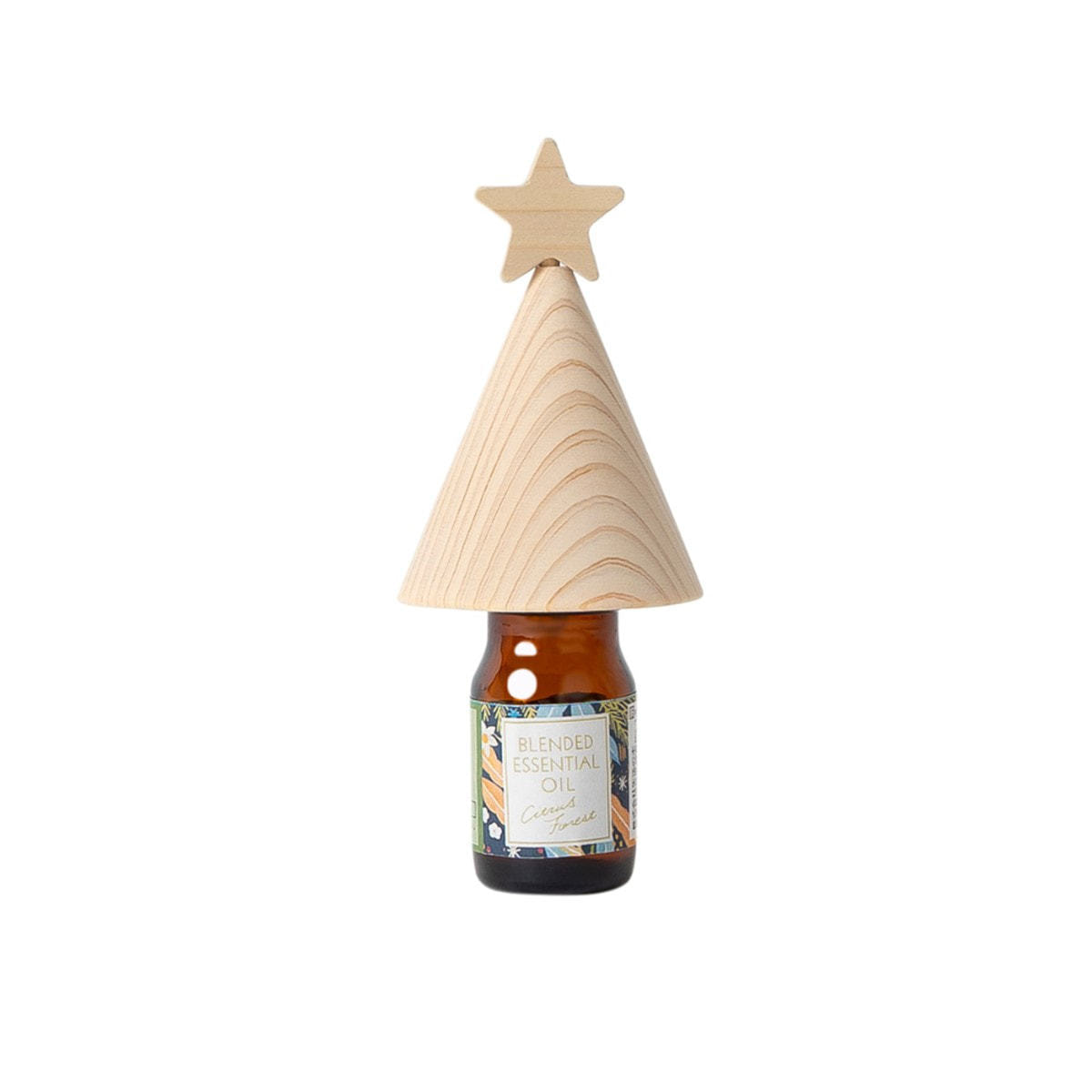 国産ヒノキでできたツリー型のアロマキャップとブレンド精油のセットです。