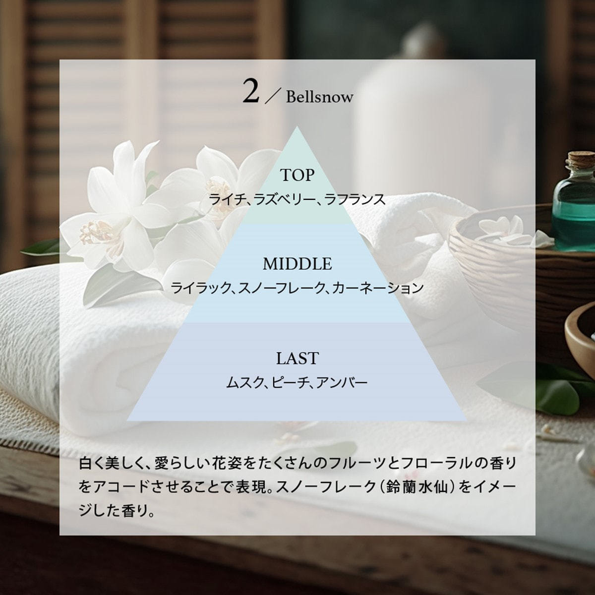 白く美しく、愛らしい花姿をたくさんのフルーツとフローラルの香りをアコードさせることで表現。スノーフレーク(鈴蘭水仙)をイメージした香り。