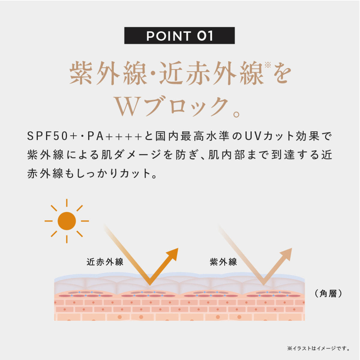 SPF50+・PA++++と国内最高水準のUVカット効果。さらに、肌内部まで到達する近赤外線*もしっかりブロック。