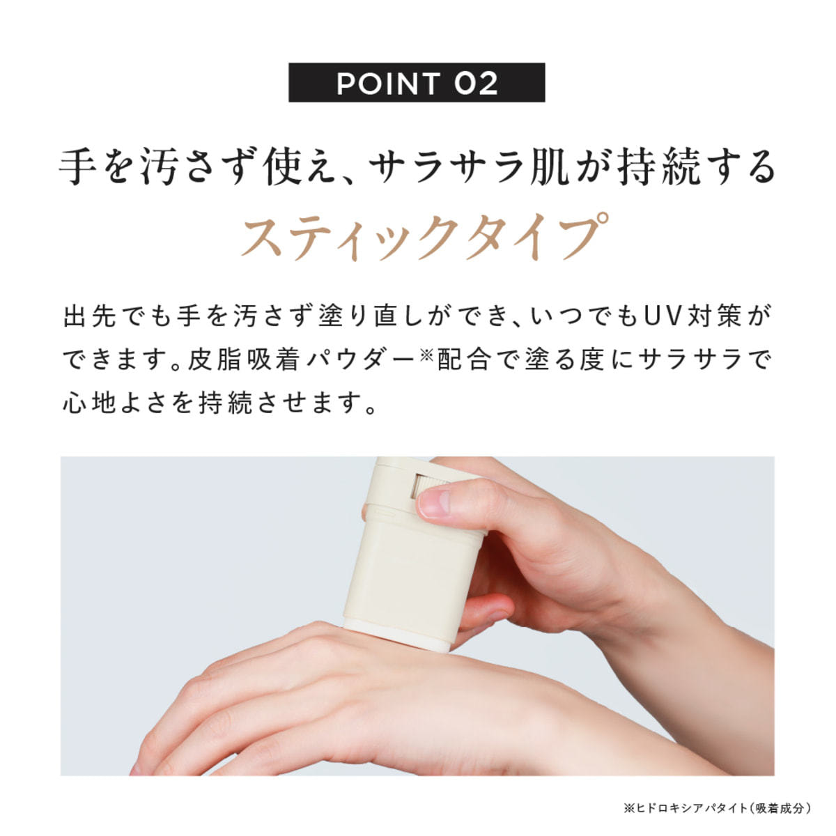 ・スティックを容器から5㎜ほど繰り出し、肌に直接フィットさせ、塗りムラのないように塗布してください。