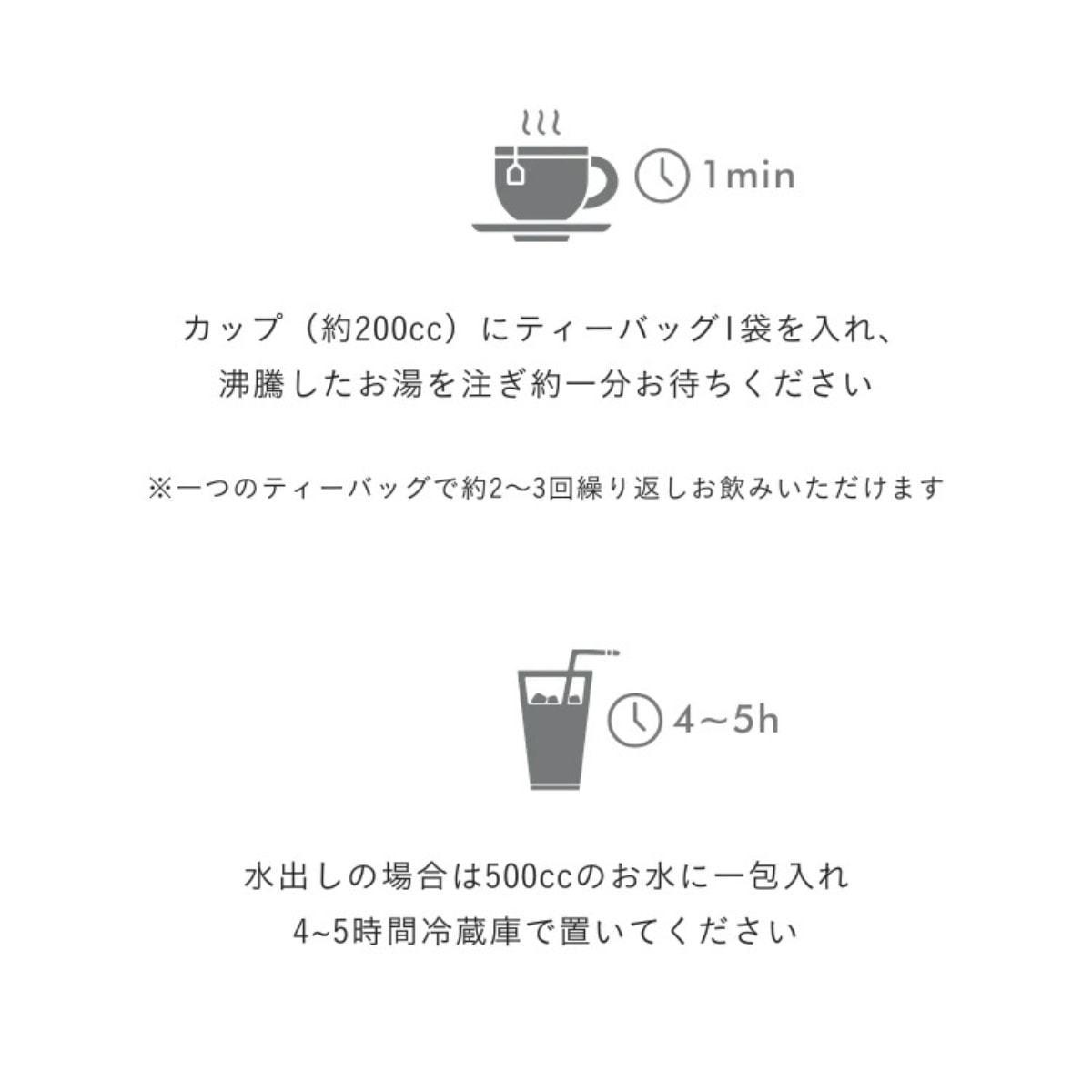 ・カップ(約200cc)にティーバッグ1袋を入れ、沸騰したお湯を注ぎ約1分お待ちください。